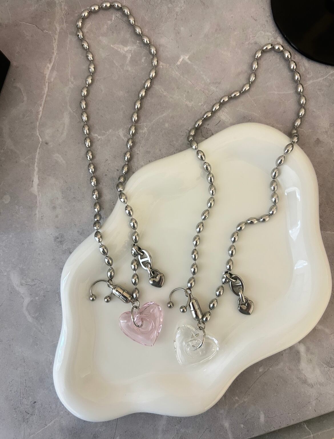 うるちゅるんなガラスオープンガハートとサイドのチャームが相性バッチリなネックレスです♡