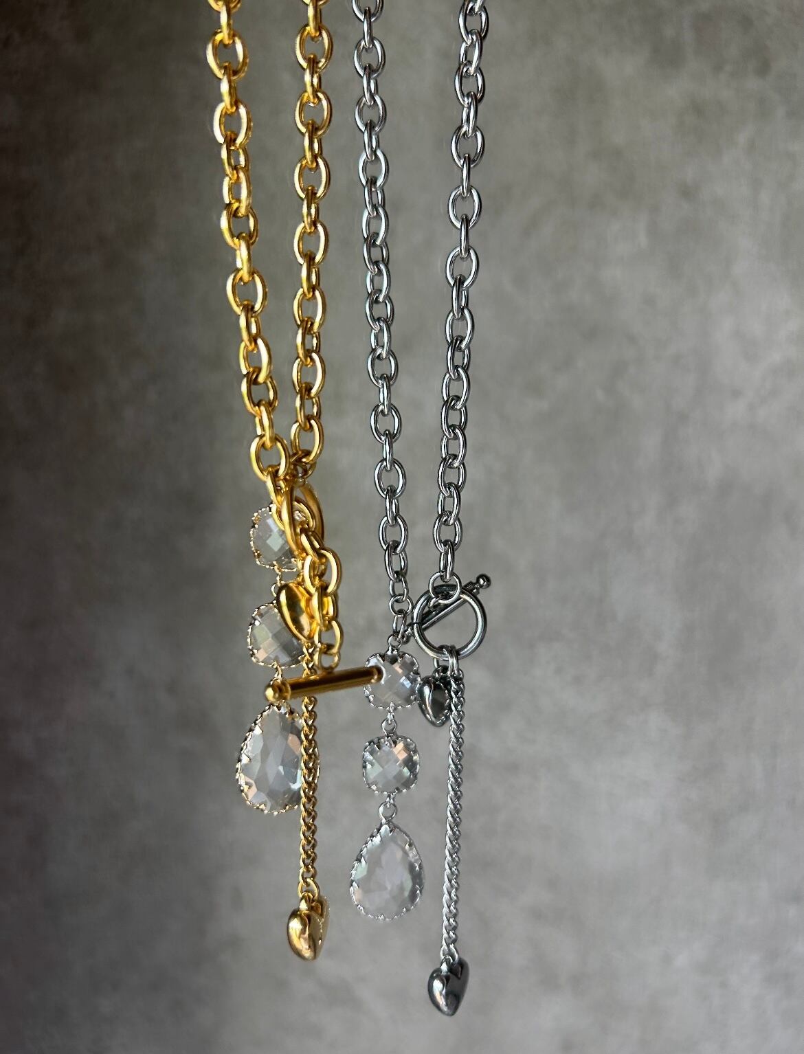 光に触れると反射してキラキラな3連雫のクリスタルガラスと2連ハートがシンプルの中にヒトクセあるデザインのネックレスです♡