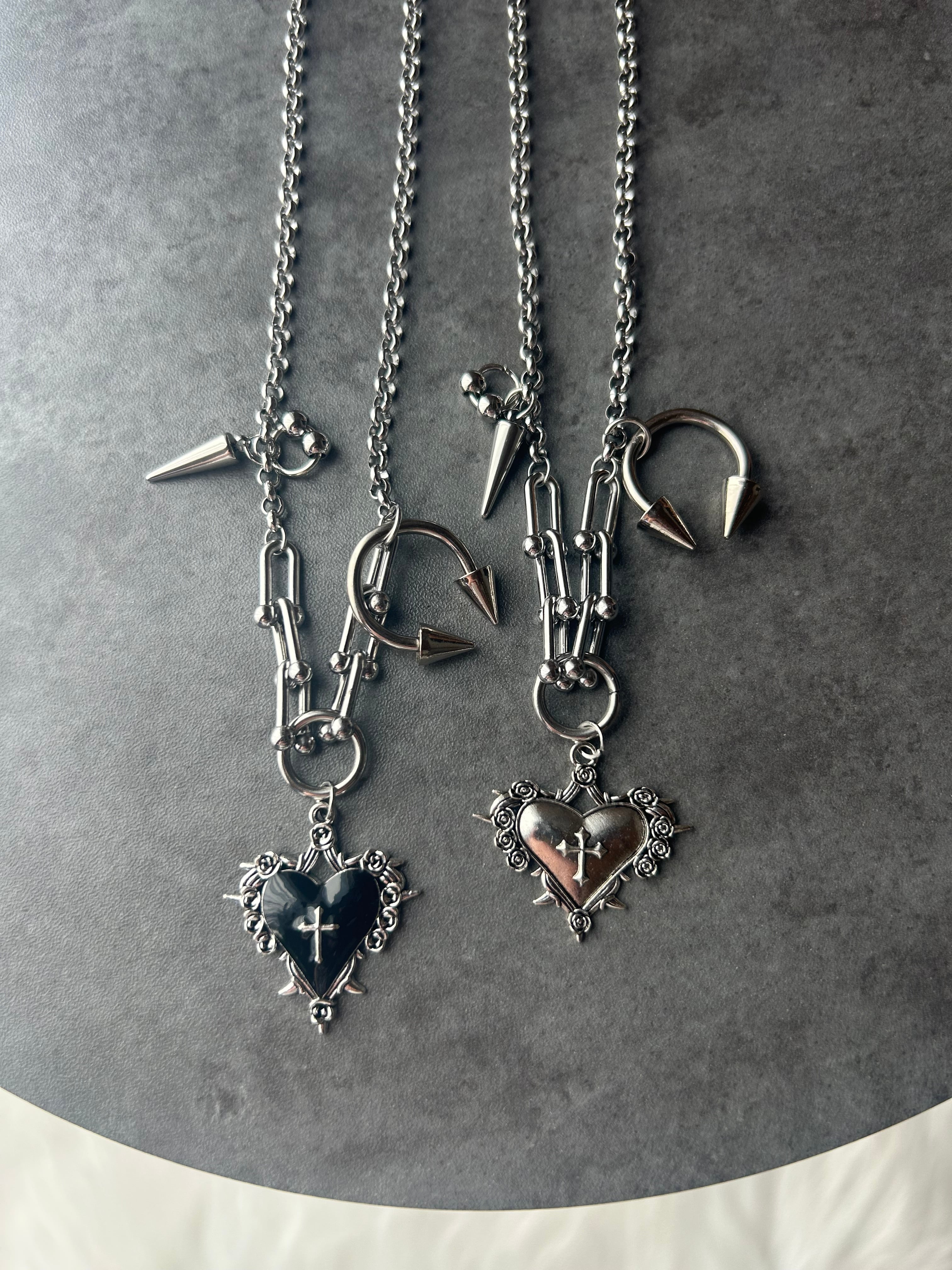 ヒトクセあるデザインのトゲトゲハートとサイドのボディピアスチャームが相性バッチリなネックレスです♡
