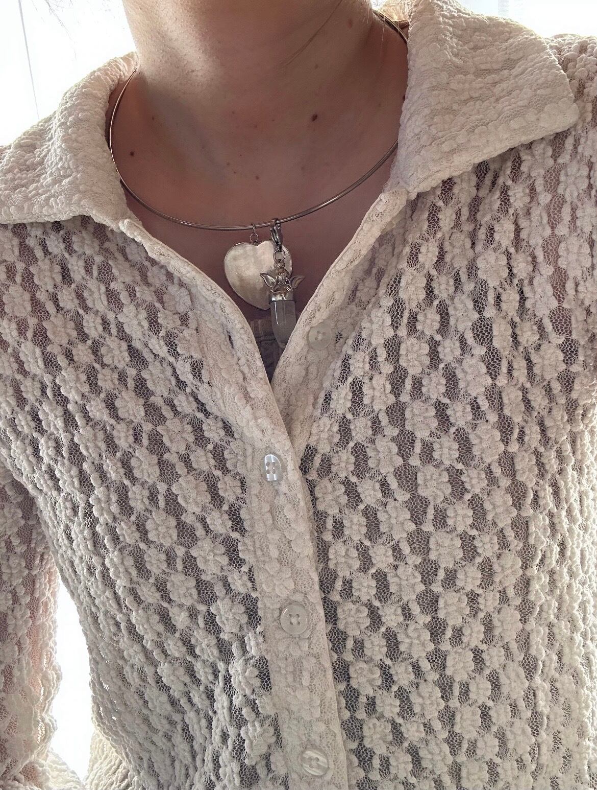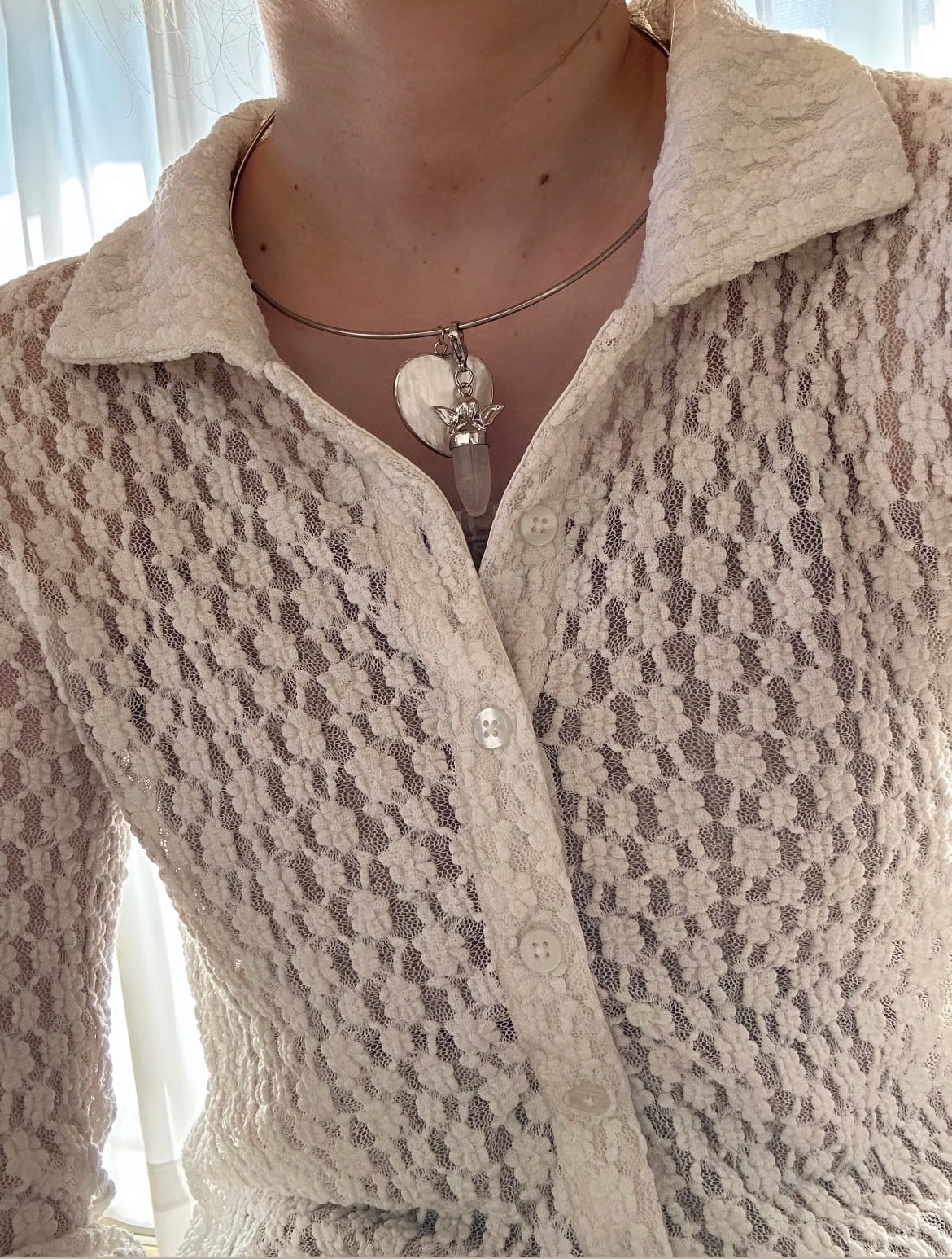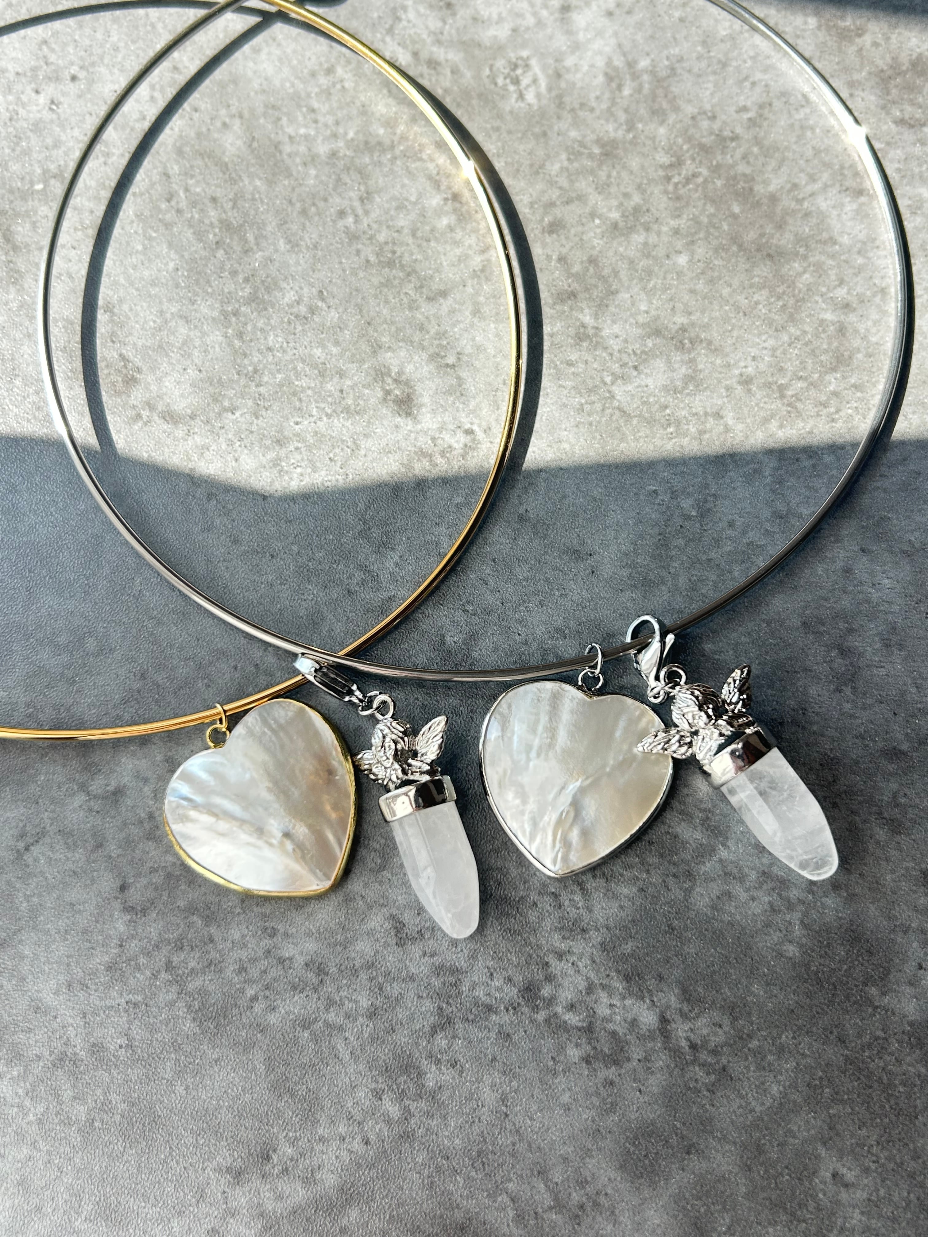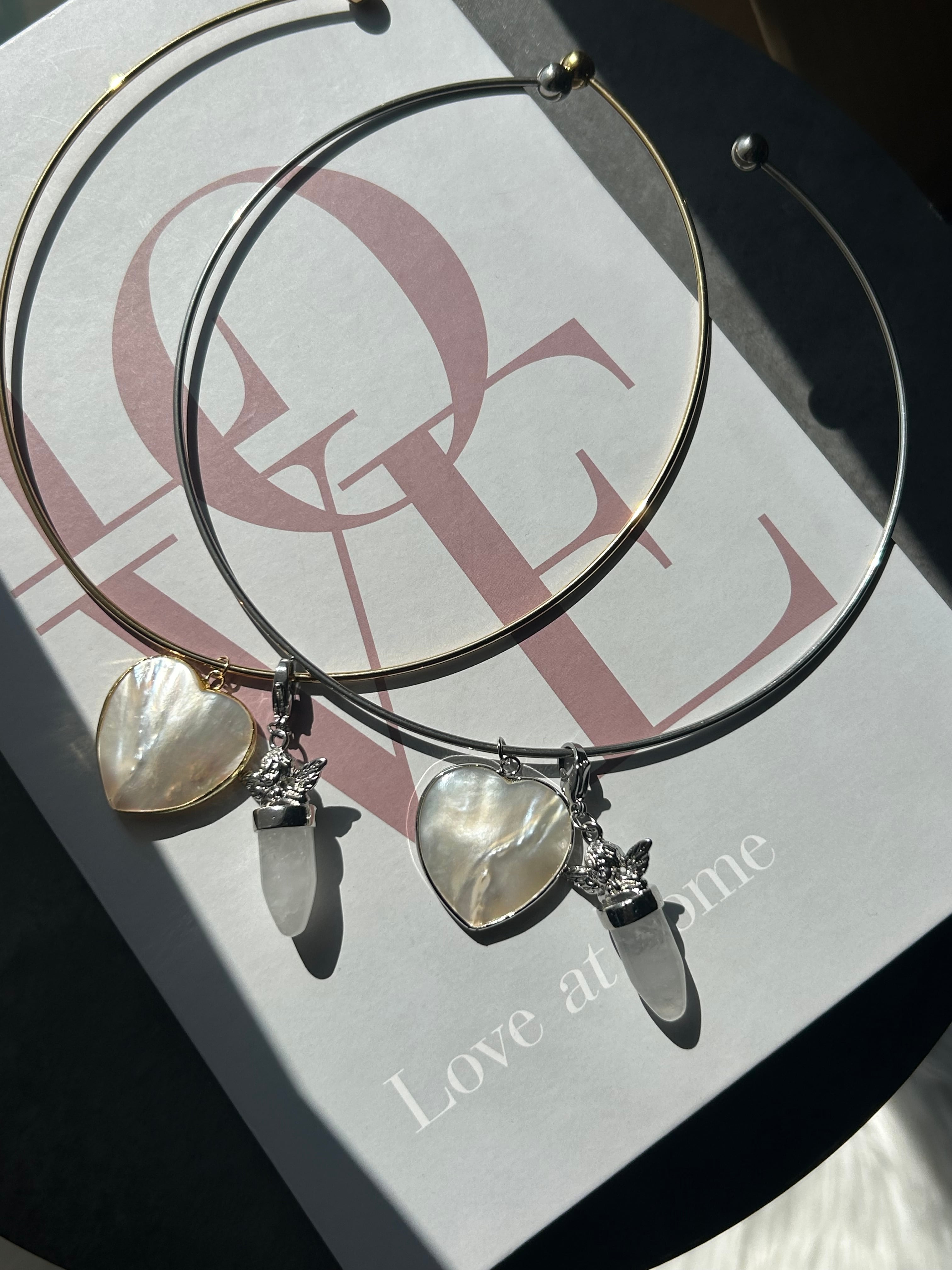 華奢なフープチェーンや艶感あるシェルハートと取り外し出来るエンジェルストーンチャームが首元を綺麗に見せてくれます。