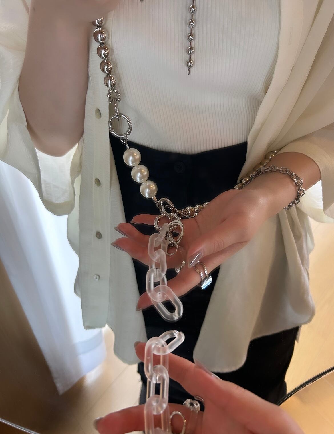 素材/アクリルビーズ、アクリルチェーン、真鍮