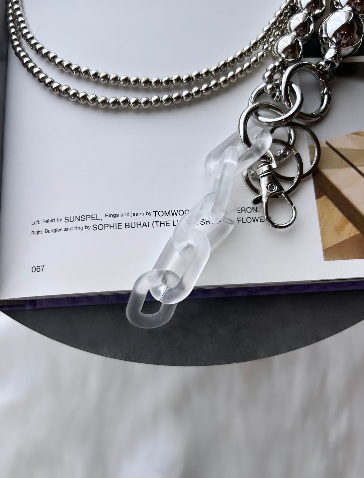 シンプルなデザインに"ヒトクセ"なチャームやチェーンでカジュアル 、モード 等どんなコーディネートにも馴染むストラップです。