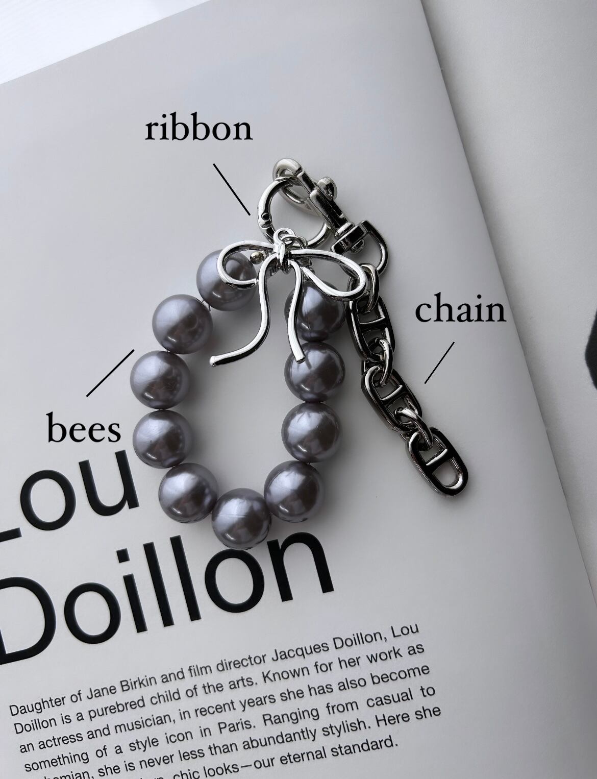 スモーキーグレーの淡いニュアンスカラーとシルバーの組み合わせが大人でも上品に身に付けられるマルチストラップです。