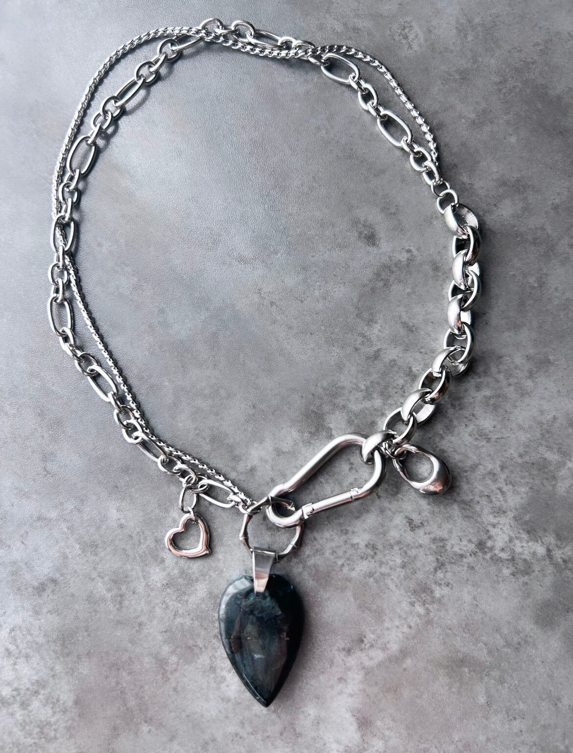 2連になったデザインのチェーンと厳選したハート天然石、パーツも全てステンレス、エンドチャームもヒトクセある可愛いチャームで一つ一つこだわってお作りしました。