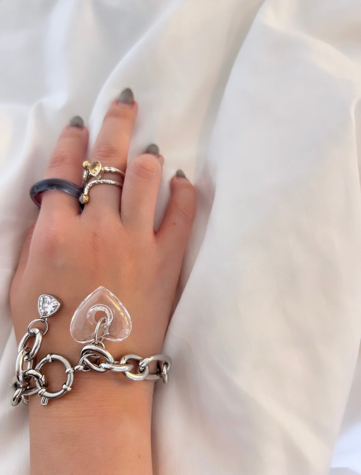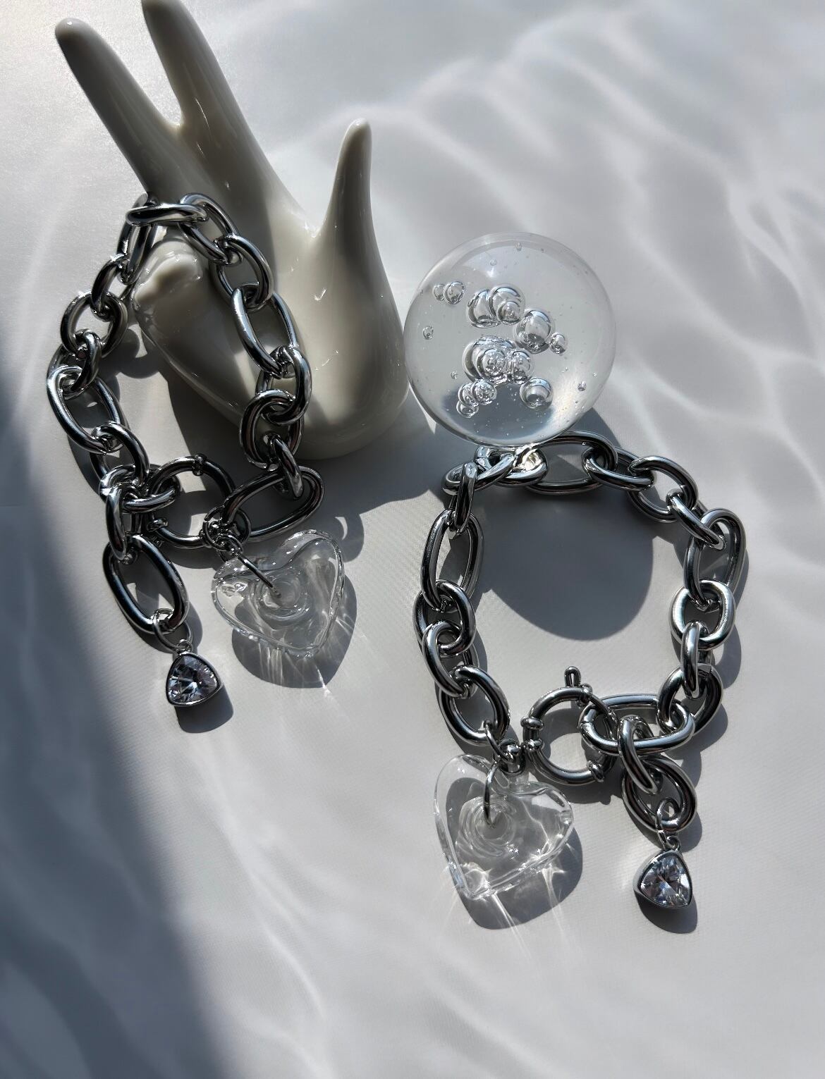 透け感&ぷるぷる具合がたまらないうるちゅる~んなガラスハートチャームとキラキラジルコニアチャームのシルバーブレスレットです♡