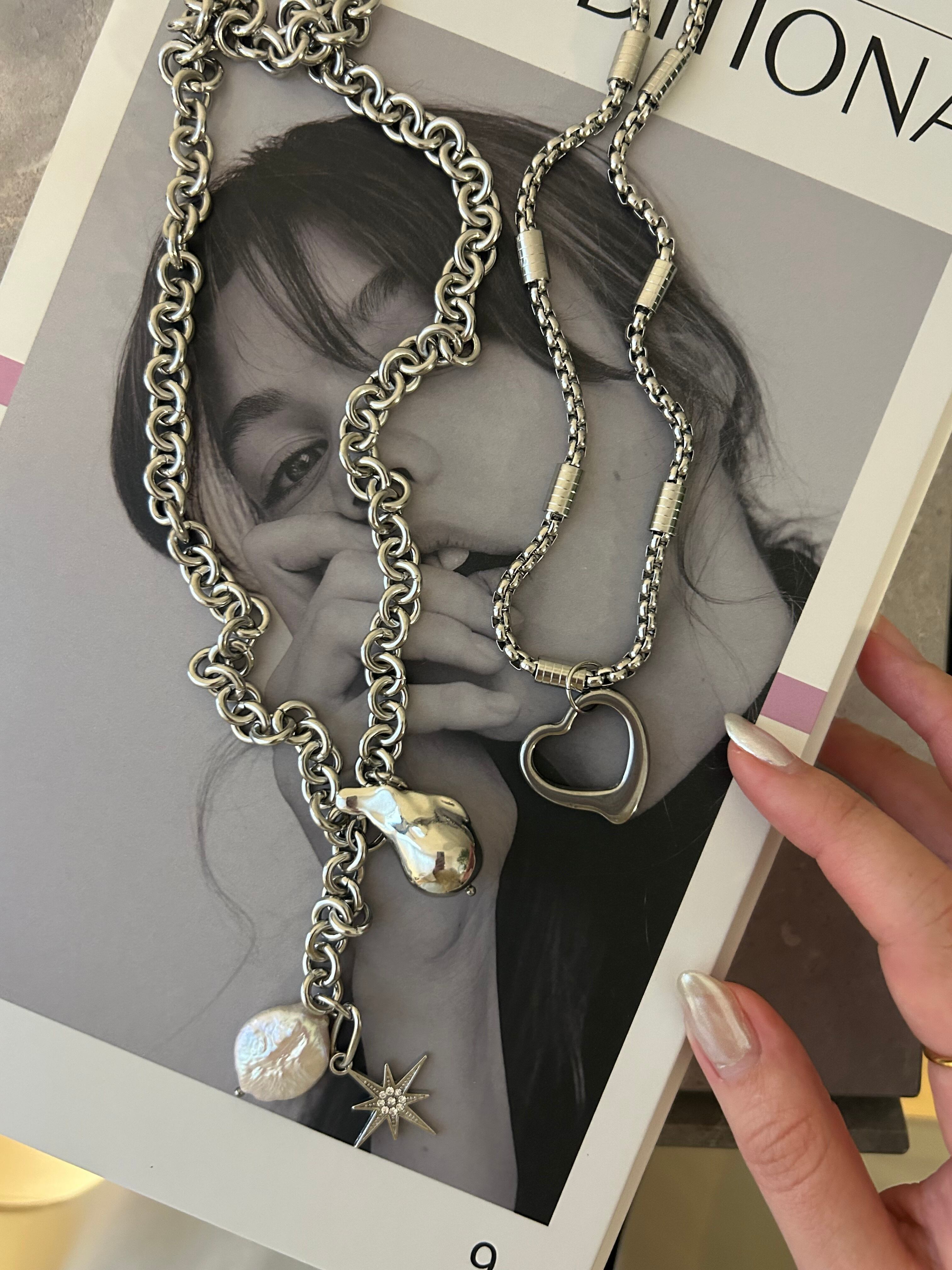 シルバーのデザインチェーンがヒトクセあり、通年通してシーンを問わずお使いいただけるネックレスです。